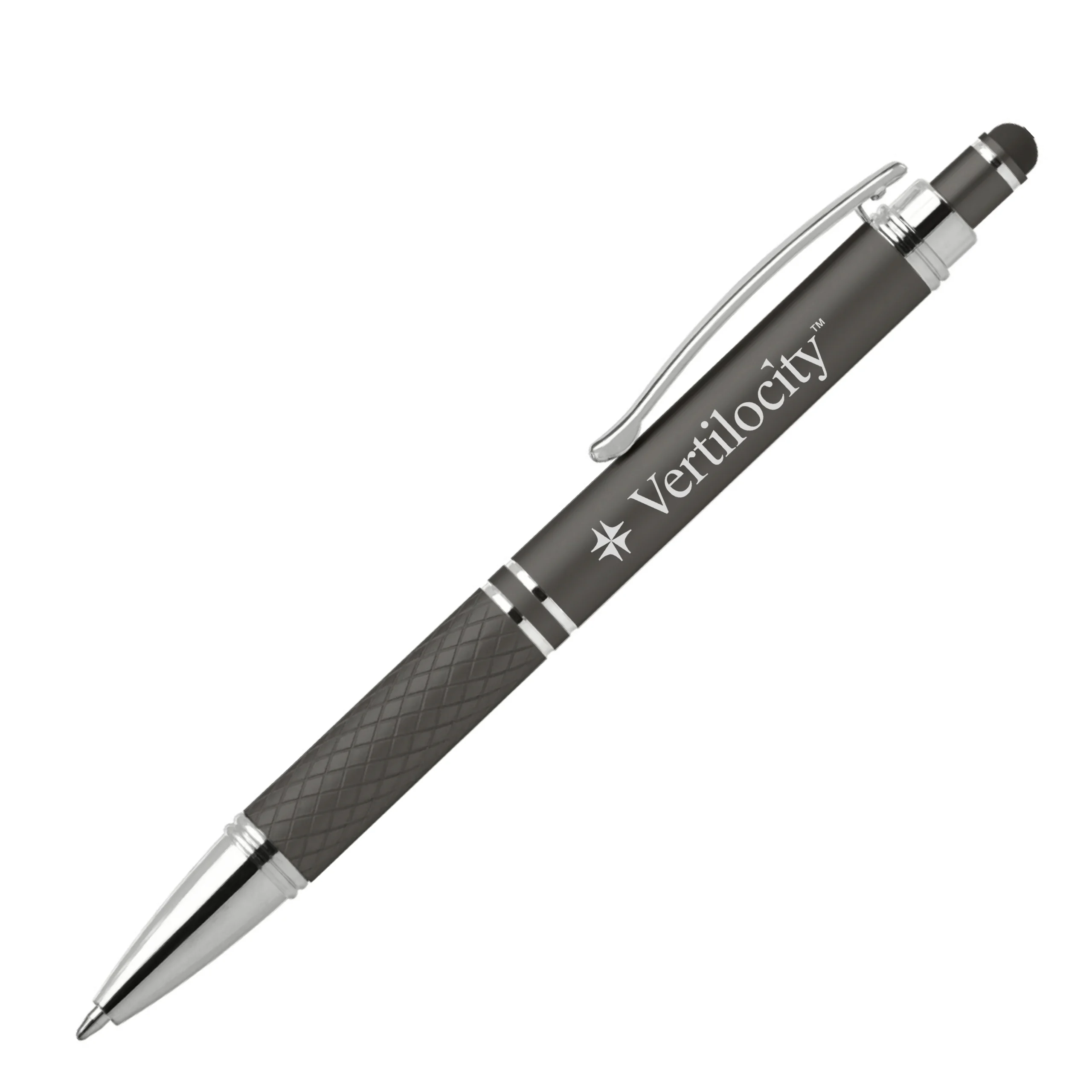 The Phoenix Softy Metallic features luxurious soft-touch finish in rich, metallic colors on the barrel and on the diamond-textured grip. Polished chrome accents, trim and clip create a sophisticated look. Choose from a variety of premium barrel and matching stylus colors. Customize with your brand using our precise laser engraving in silver.